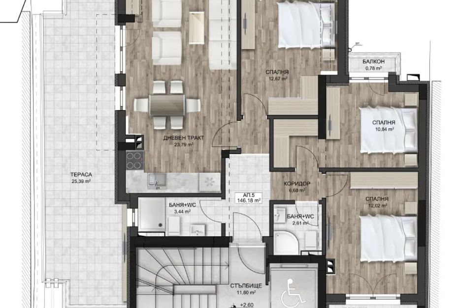 Разпределението включва три спални, дневна с кухненски бокс, три тераси и два санитарни възела, осигуряващи функционално ползване на пространството.