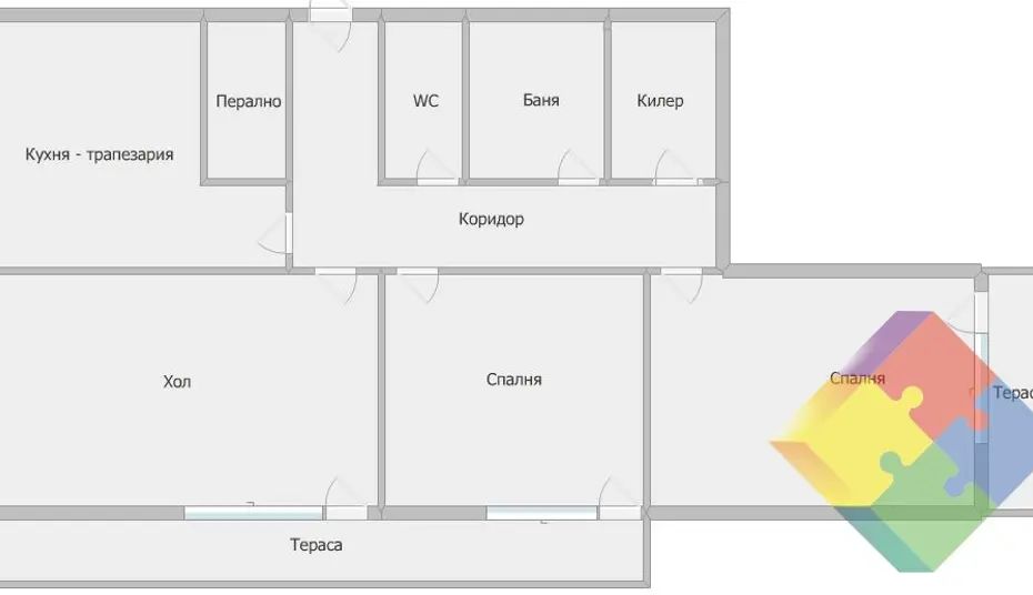 Бетър Хоумс предлага за продажба жилище със следното разпределение: просторен хол с излаз на голяма тераса, две спални с излаз на тераси, трапезария с кухненски бокс, голям коридор и четири сервизни помещения - баня, тоалет, перално и килер. Към апартамента има избено помещение 7 кв. м. Всички стаи са с правилни форми.