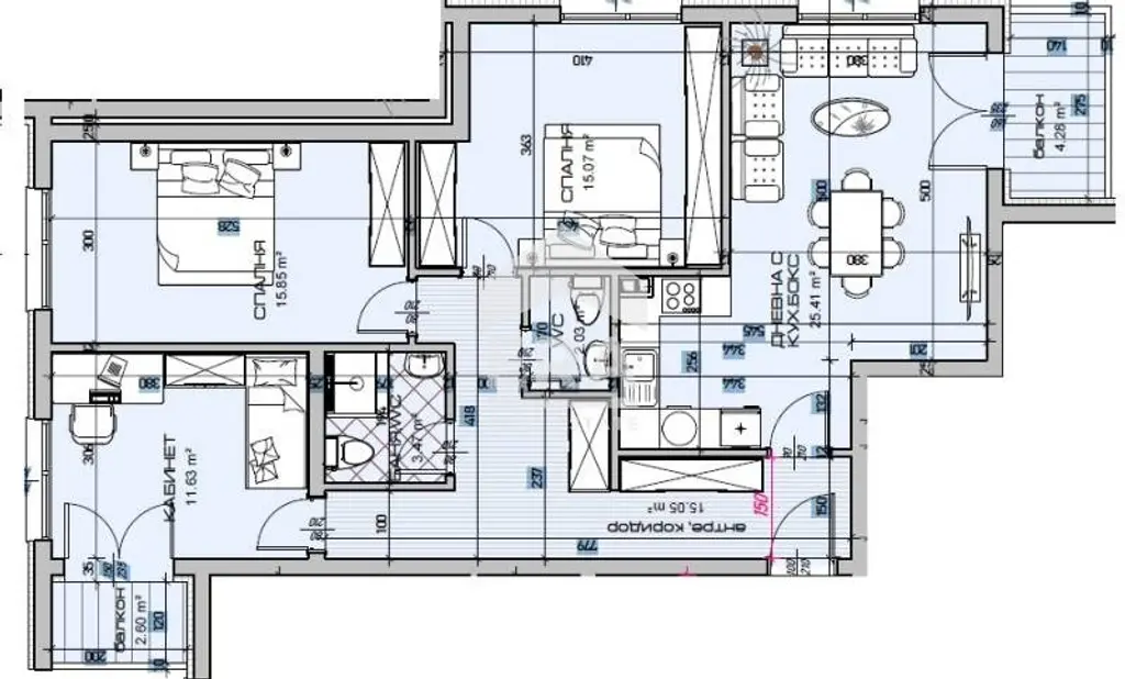 ЕРА Вива продава четиристаен апартамент в новострояща жилищна сграда в кв. Виница, гр. Варна. Имотът се намира на трети етаж от общо четири и е със застроена площ от 143 кв.м. /143 кв.м. с общите части/. Състои се от коридор /15 кв.м./, дневна с кухненска част /26 кв.м./, три спални /16, 15 и 12 кв.м./, баня с тоалет /3,5 кв.м./, отделен тоалет /2 кв.м/ и два балкона /4 и 3 кв.м./. Прилежащо избено помещение с площ от 8 кв.м. Жилището е със статут на апартамент и ще бъде завършено по БДС. Коридори, кухня и стаи: под циментова замазка, стени бяла гипсова мазилка, таван гипсова шпакловка; Санитарен възел: стени и таван мазилка, под замазка. Монтирани изводи за климатици във всички стаи. Външна блиндирана врата.