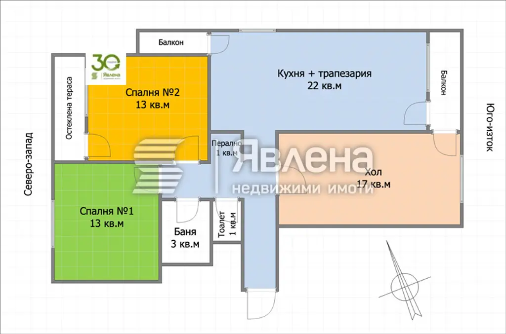 Застроената площ е 87 кв.м, към апартамента има и маза от 6 кв.м. Разпределението е много функционално две спални по 13 кв.м, просторен югоизточен хол 17 кв.м, голяма кухня с трапезария 22 кв.м, отделни баня и тоалетна, перално помещение и три балкона, два от които са остъклени. Апартаментът е светъл, просторен и много уютен.
