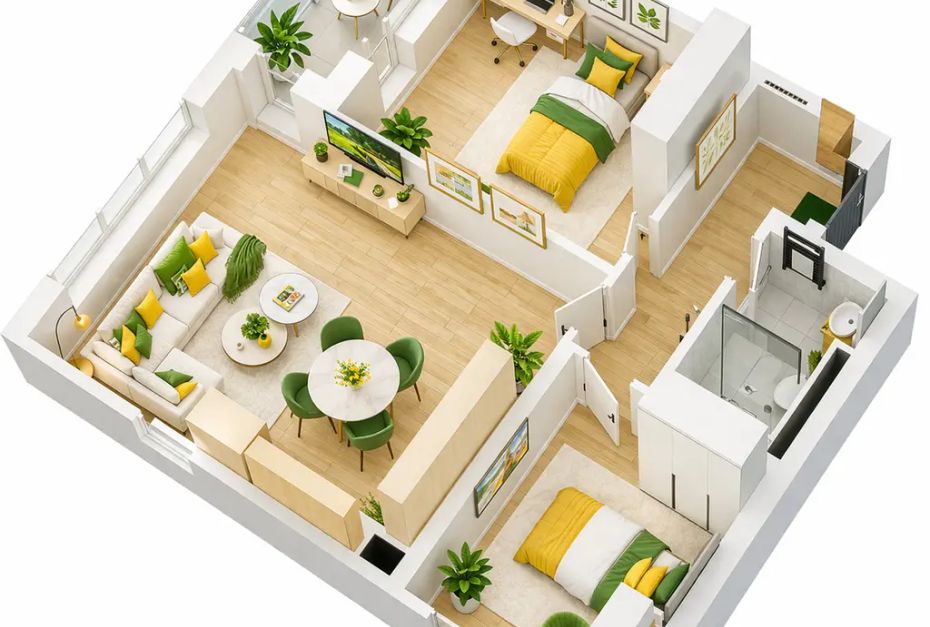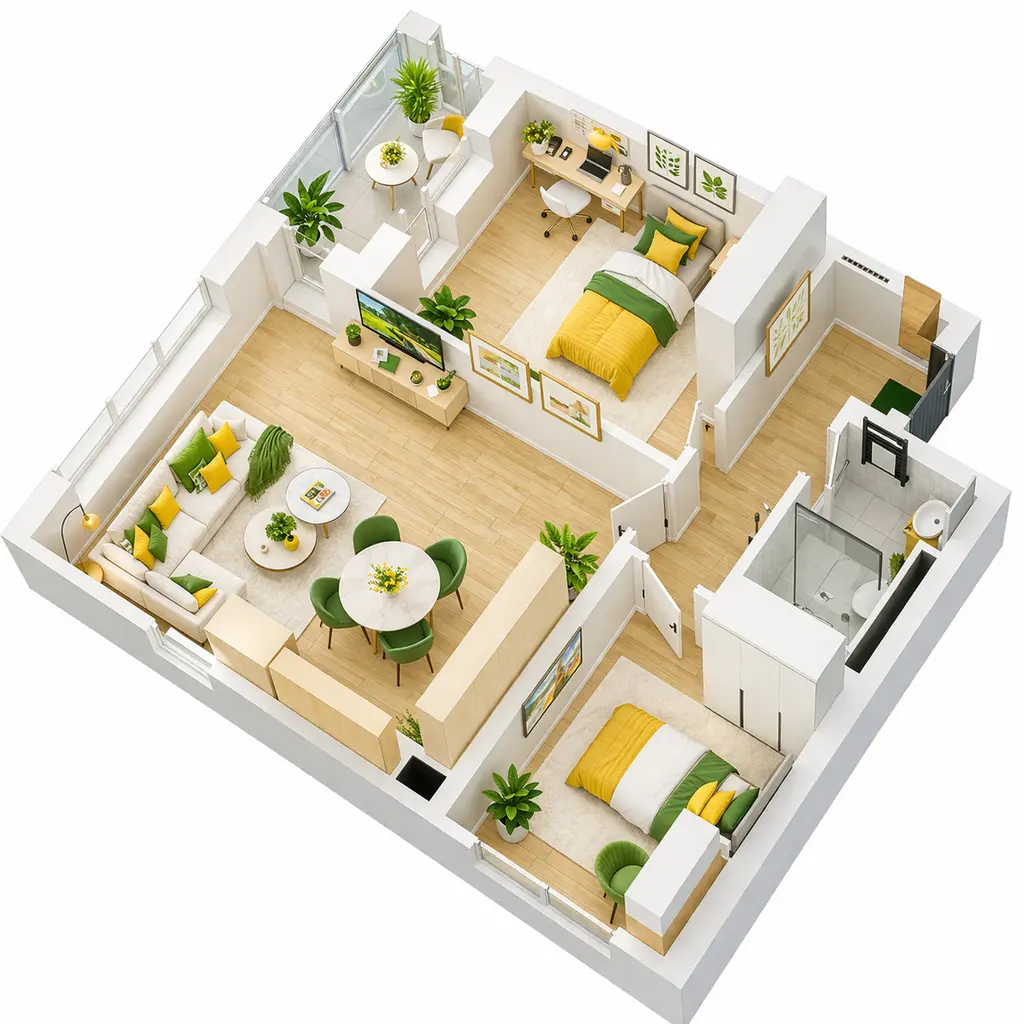 Разпределението включва дневна с кухненски бокс, две спални, баня с тоалетна, тераса и коридор, осигуряващо удобство и функционалност.