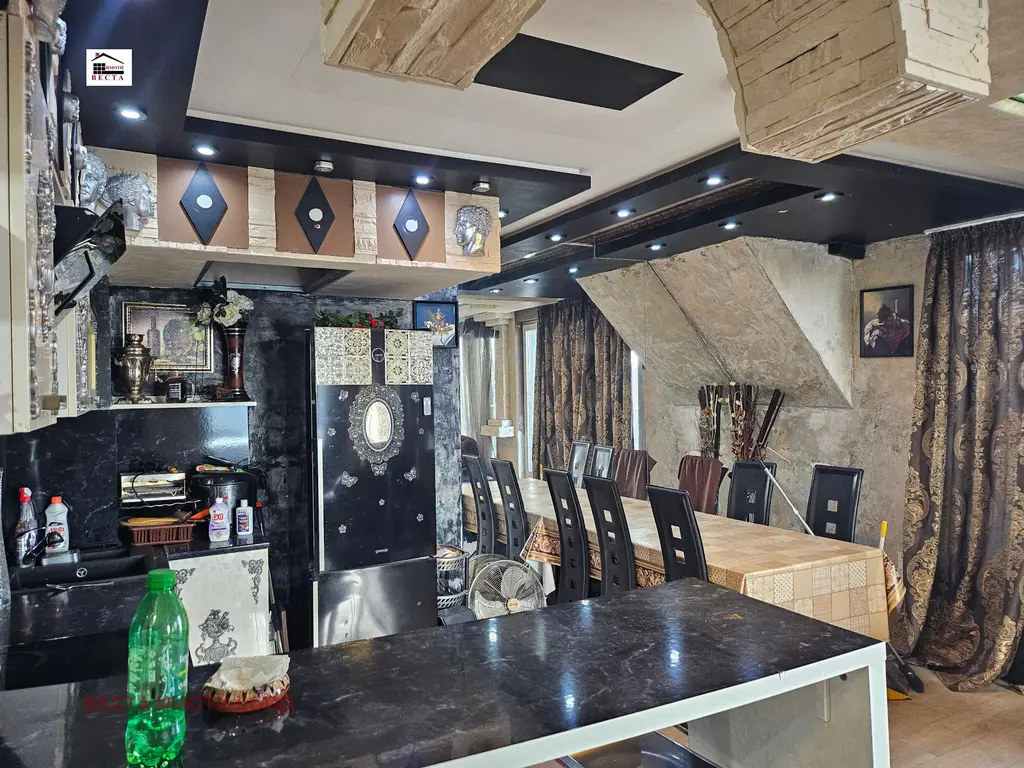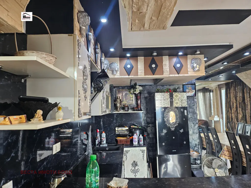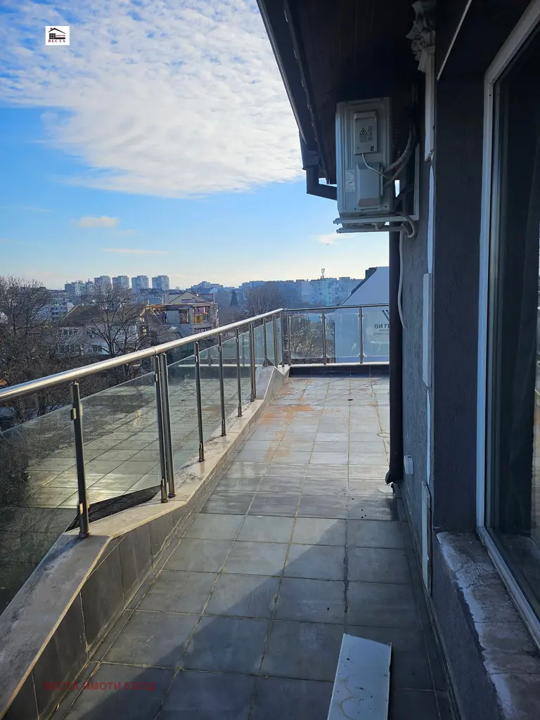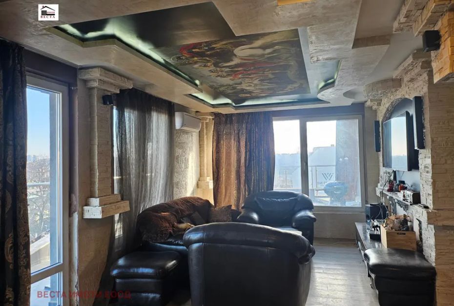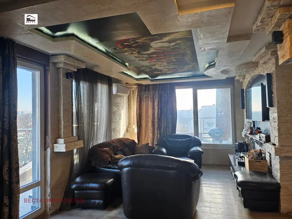,, Веста Имоти ООД предлага отличен просторен и светъл апартамент, разположен в близост до фабрика Христо Ботев. Апартамента се намира в тухлена сграда с асансьор, който влиза в апартамента. Има допълнителен вход с широко и конфортно стълбище от долния етаж. Жилището е със статут на апартамент и предлага функционално разпределение: входно антре, просторна дневна с кухня, просторна тераса на две нива, две спални, баня с тоалет, сауна, джакузи и изба. Има прекрасна гледка към езерото и Аспарухов мост. Жилището е в добро състояние . В района има всичко необходимо за нормален и спокоен живот. Има магазини, супермаркети, детски градини, училища.