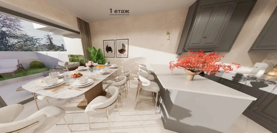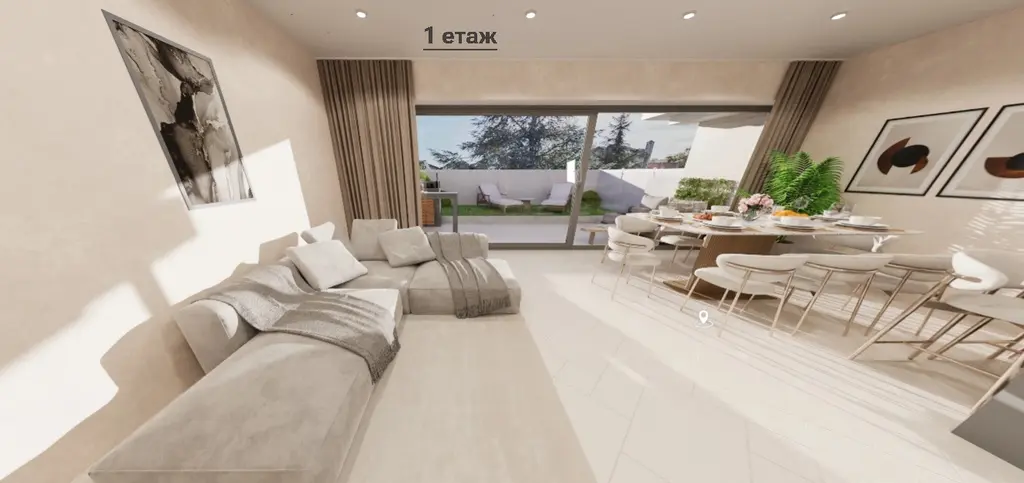 Разпределението включва дневен тракт с кухненски бокс (40 кв.м), две спални, две бани с тоалетна, лоджия и двор от 50 кв.м. Пространството е функционално, без излишни коридори, което осигурява ефективно използване на площта.