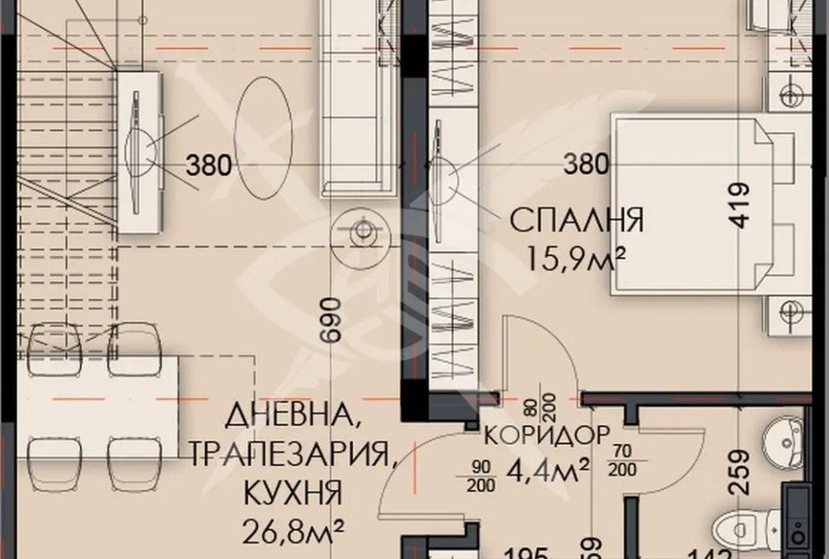 РАЗПРЕДЕЛЕНИЕ: Жилището разполага с площ от 159 кв.м., разпределена в две нива: