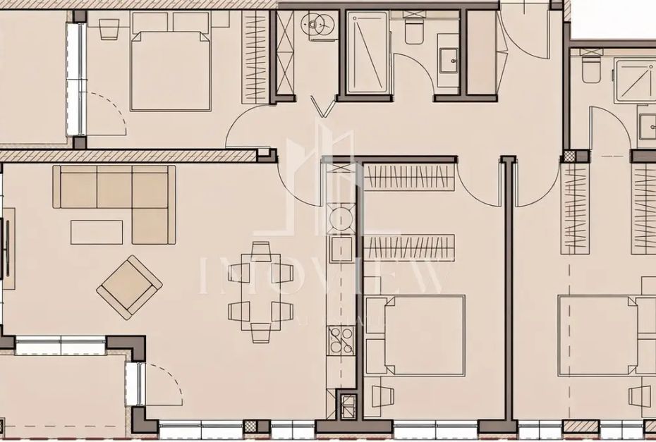 Имотът представлява: Входно антре, голяма дневна 30м2, три просторни спални 2х15м2, две санитарни помещения, две тераси и килер.