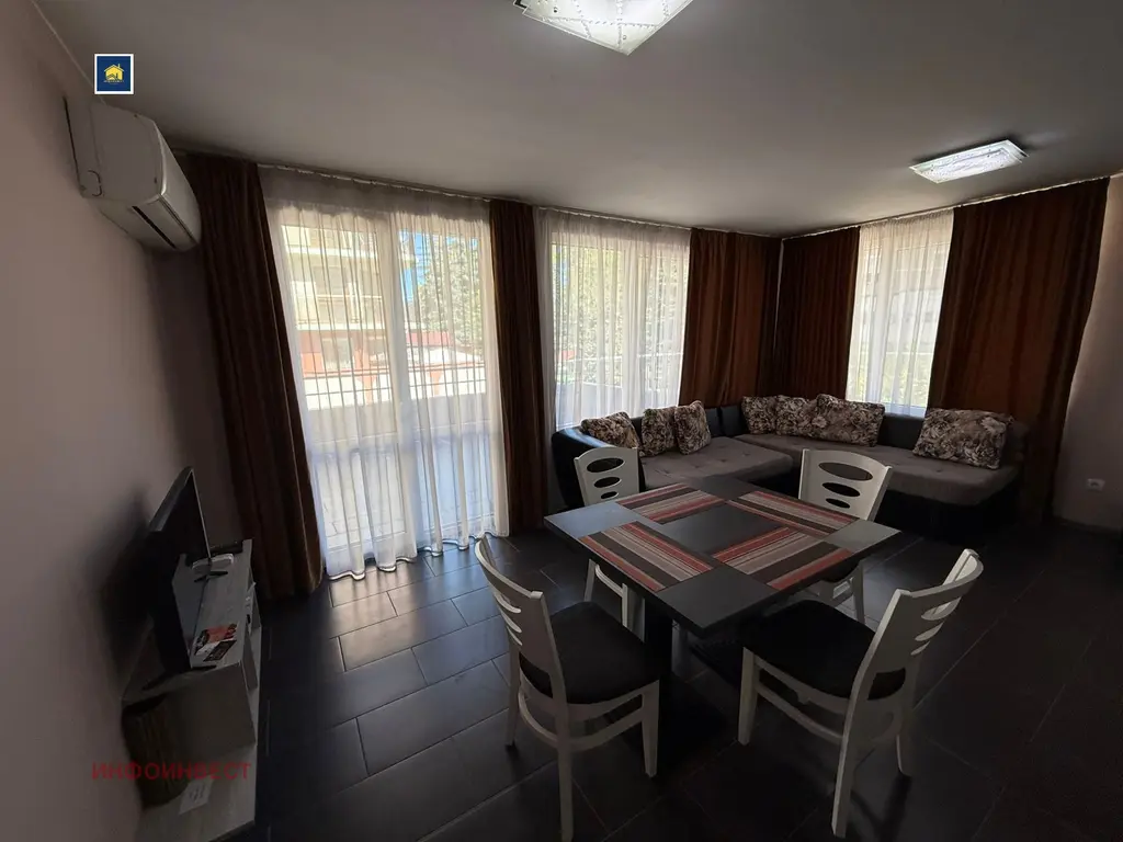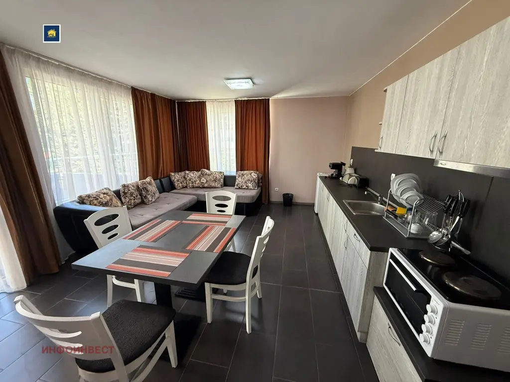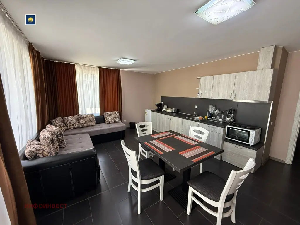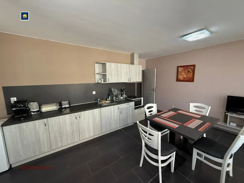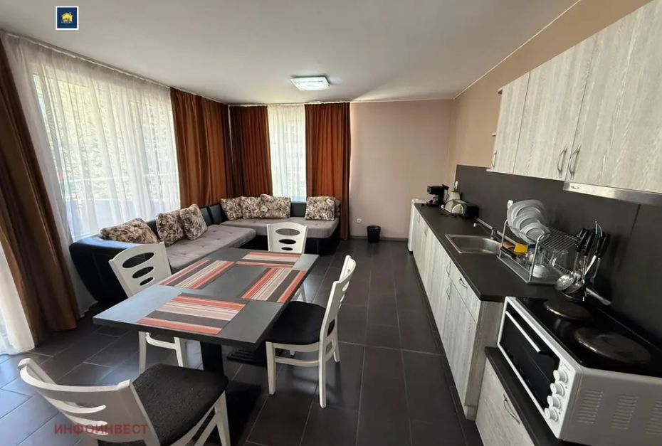 Прекрасен двустаен апартамент, с достъпна локация, намиращ се в зоната на ресторант 'Паничките'. Напълно обзаведен и оборудван с всичко необходимо за едно домакинство, готов за живеене. Имотът се състои от просторна дневна с кухня, спалня, баня с тоалетна, както широк балкон, за чудесно прекарване на летни вечери и не само. Има опция да се закупи и паркомясто, което струва 5000 евро .