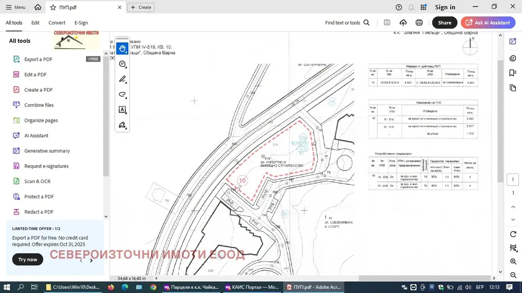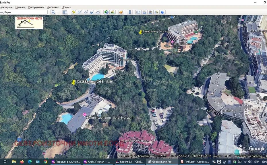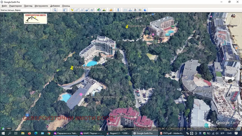 ID. 4460 Североизточни имоти Ви предлага за продажба парцел в к.к. Златни пясъци с площ от 3352квм за жилищно и курортно строителство с ПУП с параметри на застрояване пл.30% кинт 1.5 и височина 15м Възможно е постигане на РЗП- 5000квм . Намира се на комуникативно място, с лице на асфалтов път с два подхода и с нескриваема морска панорама от кота 0. Всички комуникации-ток, вода, мръсен канал са на границата на имота, както и необходимите становища за присъединяване. Разстоянието до морето и плажната ивица е 300м , а до гр. Варна са 18км. до Кранево са 4км и до кк.Албена 7км.
