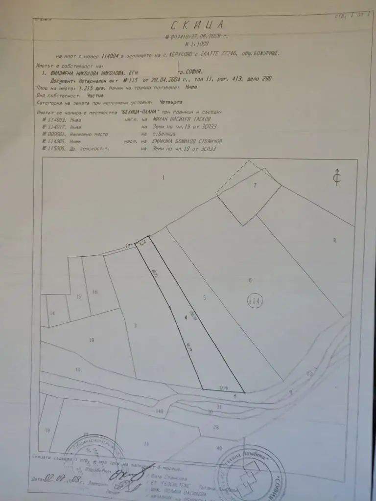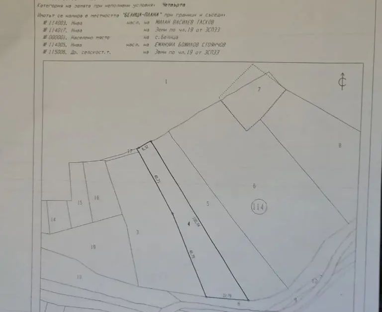 Намира се в местността Белица-Плана. Непосредствено до къщи (ток и вода). Статут нива. Подходящ за вкарване в регулация и строителство.