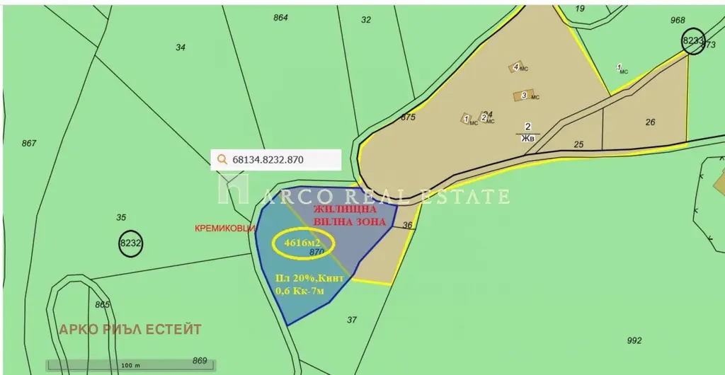ARCO REAL ESTATE Продава парцел за жилищно строителство -4616м2, гр.София кв. Кремиковци ,зона-Жв, Пл.20%, Кинт-0,6, Кк7м, РЗП-2770м2 , панорамен, ток,вода, Подходящ за еднофамилни къщи.В сърцето на гората , тишина и свеж въздух,до ловната хижа Стрелец.Агенцията работи по изискванията на БДС EN 15733. Предлагаме съдействие за ипотечно кредитиране към всички банки на преференциални условия чрез лицензиран Кредит мениджър към БНБ. Изготвяне на пазарна оценка на имота,безплатно юридическо обслужване и консултация. Обадете се и заявете час за оглед За всеки оглед се подписва протокол! За контакти Йошко Щрегарски тел: 0879324546 Оферта 84971