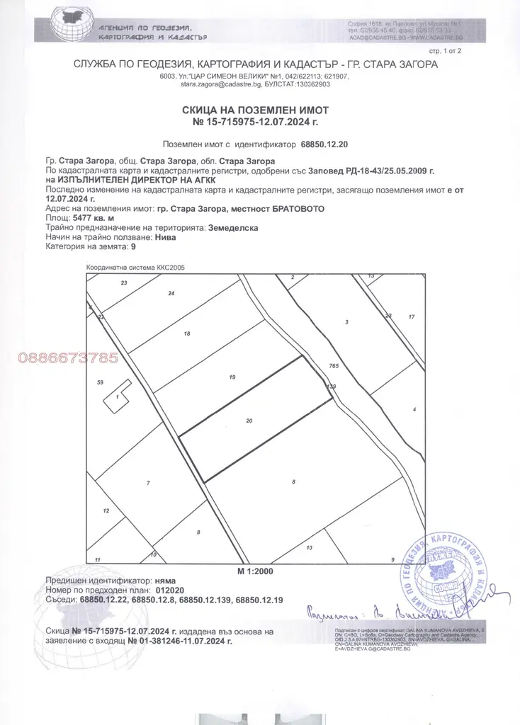 Продажба на ПИ в м. Братовото, западно от квартал Железник гр. Стара Загора. Поземления имот е с индентификатор 688850.12. 20. Предвиден е за ниско строителство. В близост е от две страни до път и с панорамна гледка.