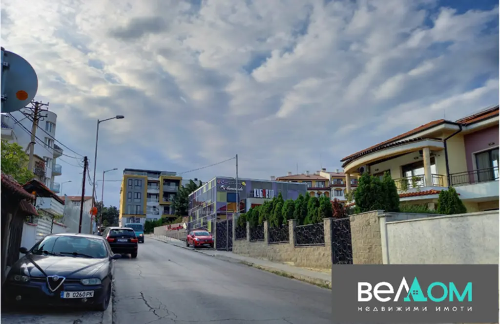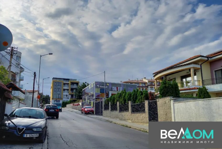 Широк асфалтов път, КАНАЛИЗАЦИЯ, водопровод, ЕЛ захранване-налични. Плавна денивелация на терена в посока юг (към морето)-1,5 м. В имота има изградена 3-ет. вила, която би могла да се реновира или да се събори и да се построят две къщи. Или да се построи 3-ет. жилищна сграда с РЗП 820 кв.м. Морска панорама ще има от последните 2 етажа.