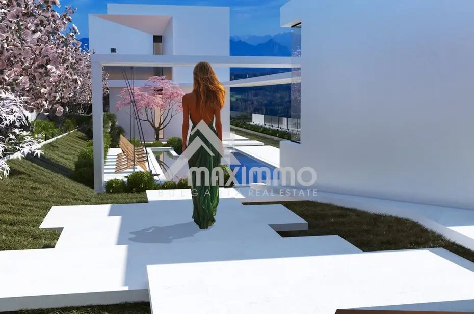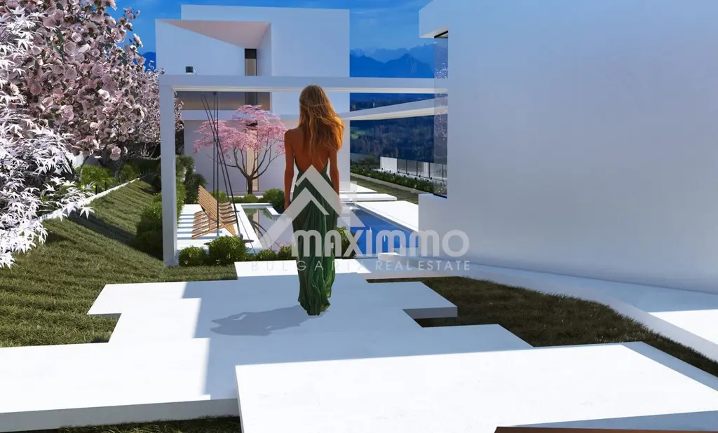 На парцел от 800 квадратни метра, в тиха и спокойна зона за живеене е разположен проект за минималистична къща с модернистична архитектура, големи стъклени витрини и тераси, придаващи уникален по рода си стил на два етажа. Първият етаж е с площ 154 м2, като на 82 м2 от тях са разположени просторна всекидневна с хол, трапезария и кухненска част, антре 11 м2, офис 20 м2, баня с тоалетна 6 м2 и лятна веранда с кухня 35 м2, която може да бъде открита изцяло посредством плъзгащите дограми, декоративните врати, както и биоклиматичната система на покрива.