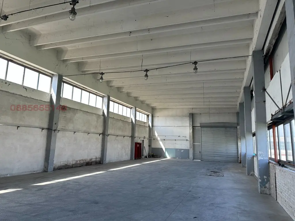 - Голям склад с размери : дължина 30м. х ширина 12м. и височина 6 м. обща квадратура 360 м2 с голяма ролетна врата за товарене и разтоварване.