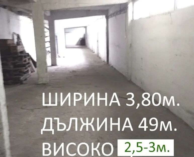 ВАЖНО: Височина 2,50-3м. и следните размери 3,80-4м ширина и приблизително 40м дължина! Товарен вход 4,80м/3 м. Под бетон, но не е шлайфан. Стени-тухла. Има трифазен ток и вода. WC до склада/помещението тя ползва се и от други наематели. Двор голям заграден и обезопасен с голяма ограда. Наблизо много места за хранене спирка на градски транспорт. Възможност за спиране на няколко автомобила в и извън двора. В имота има възможност за наемане на Офис и допълнително помещение от 97кв.м. кв.м. също така, има възможност за наем на открита заградена Асфалтирана Площ срещу допълнително заплащане. Огледи по всяко време след предварителна уговорка.