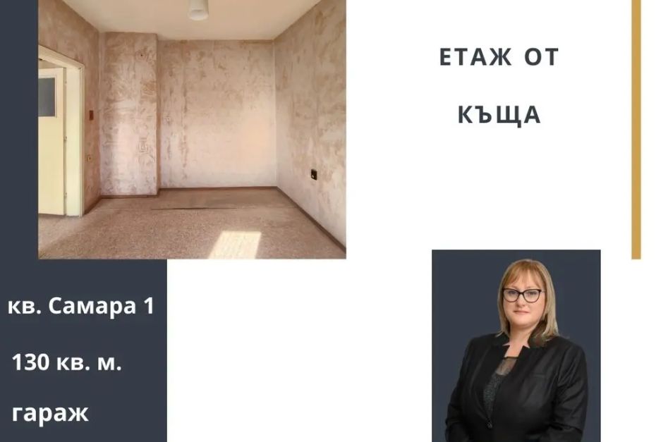Агенция Mecheva Homes продава етаж от къща в монолитна сграда кв. Самара 1. Имотът е с чиста жилищна площ 110 кв. метра. Състои се от коридор/антре, кухня със самостоятелен бокс, хол, две спални, баня (има възможност да се направи на баня с тоалетна в едно), самосточтелна тоалетна и две тераса. Изложение Юг/ запад. Към жилището има прилежаща стая 20 кв. метра, таван, гараж с канал и 1/2 идеални части от дворното място и стопанска постройка. Имотът е за ремонт. Подходящ е както за инвестиция така и за живене. В близост има спирки на градски транспорт, магазини и други.