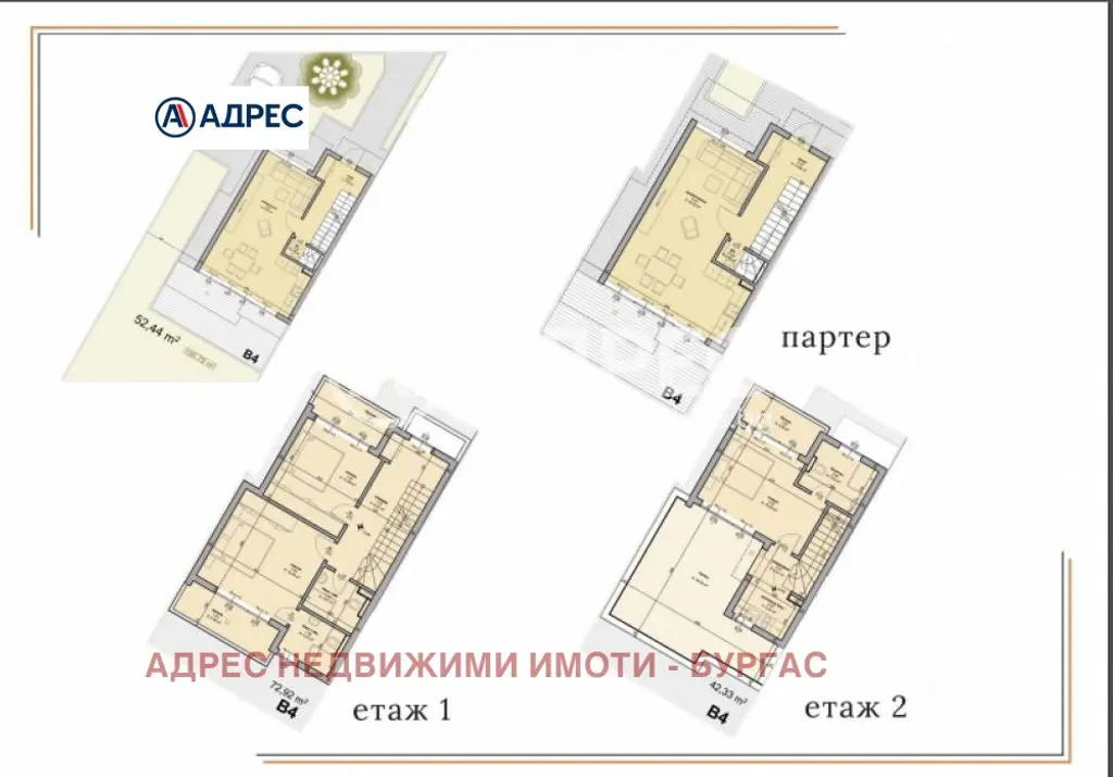 Представяме за продажба нова, еднофамилнa къща на етап Акт 14. Разпределение на трите етажа: