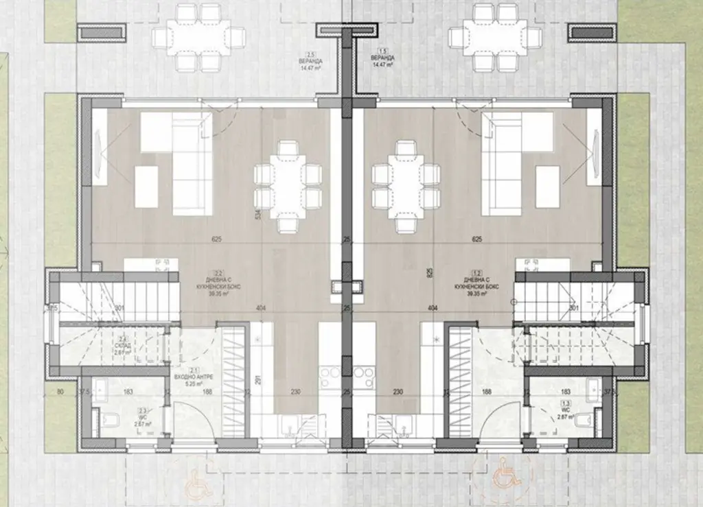 етаж 1: антре, дневна с кухня, санитарно помещение, веранда;