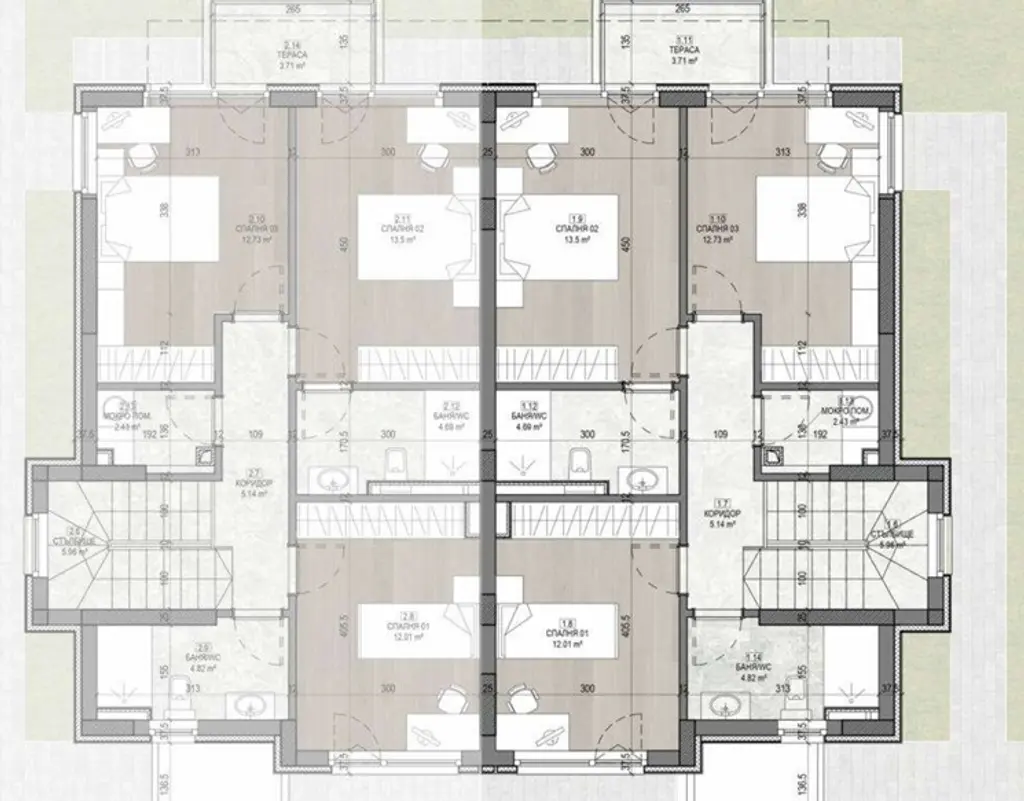 етаж 2: три спални, мокро помещение, две бани с тоалет, тераса.