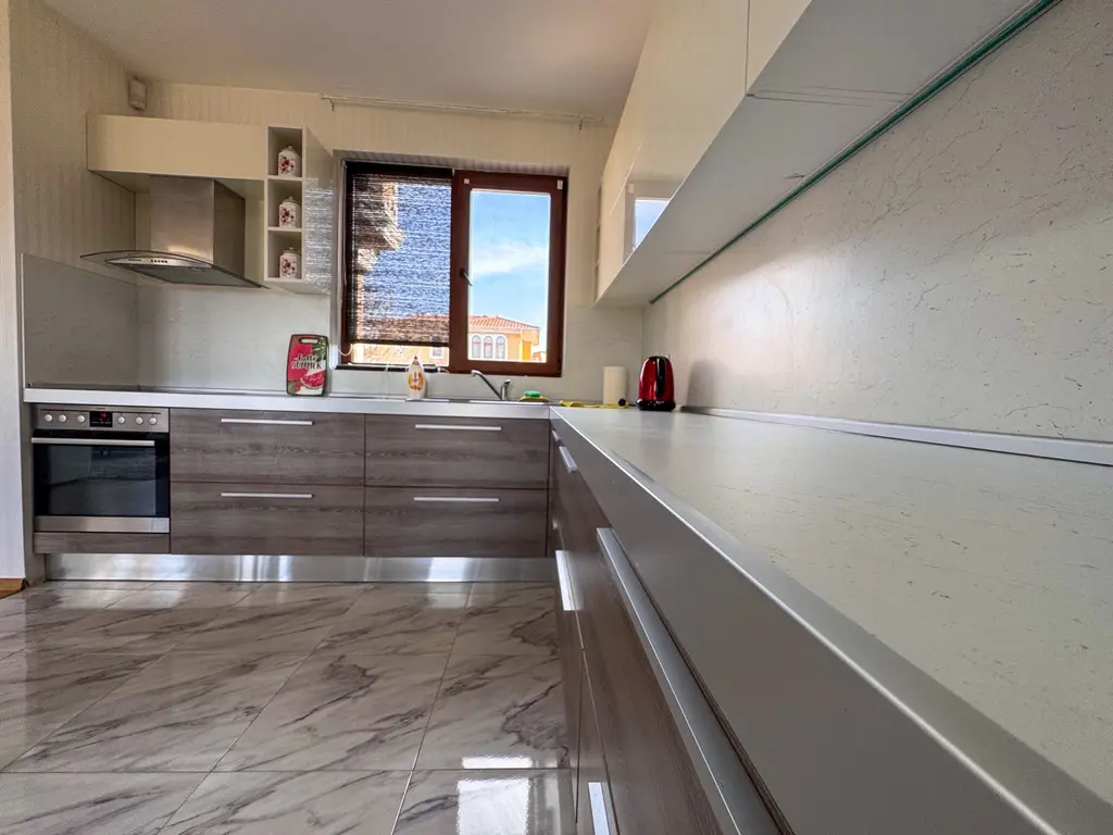 - Втори етаж: две спални, едната от които с дрешник, баня с тоалетна, слънчева тераса с гледка.