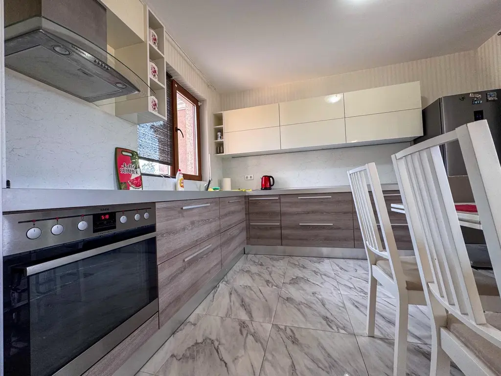 - Първи етаж: просторна дневна с веранда и озеленен двор с кухня и трапезария, баня с тоалетна, складово помещение с пералня и бойлер;