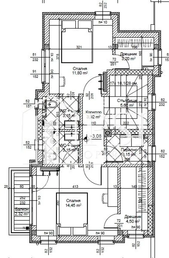 - Втори етаж: Две самостоятелни спални със собствени баня с тоалетна и дрешник, перално помещение