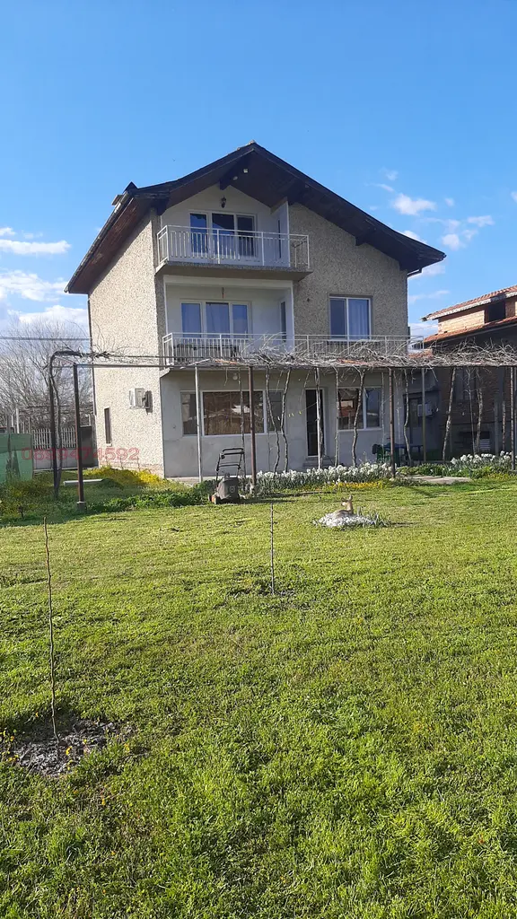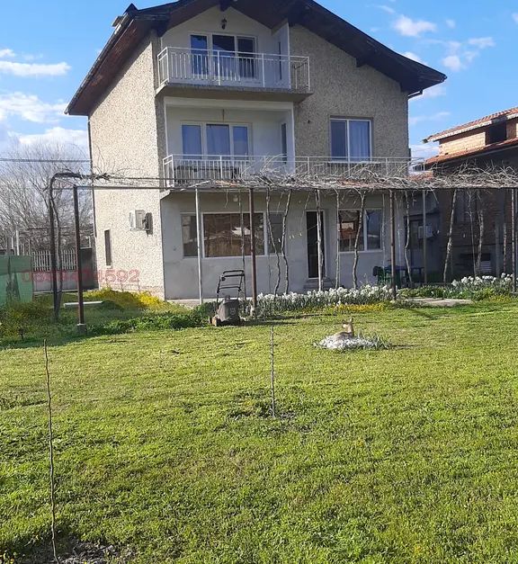 Продава се масивна къща с обзавеждане и вътрешно стълбище - 2 етажа. Първият етаж се състои от кухня, хол и вграден гараж към етажа. На втория етаж се помещават 3 спални с две тераси. Къщата има тавански помещения с една тераса, както и изба, разположена под цялата й площ.