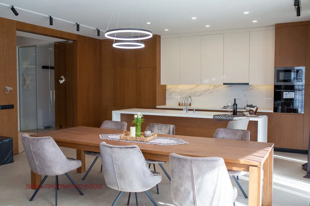 На първи приземен етаж са разположени следните помещения: преддверие, дневна с кухня и трапезария, антре с гардеробно помещение, тоалетна за гости, перално помещение, техническо помещение, гараж за два автомобила и покрита тераса.