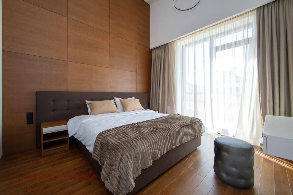 На втория етаж се разполагат: три спални, всяка със собствен санитарен възел и дрешник и покрита лоджия, гардеробни.