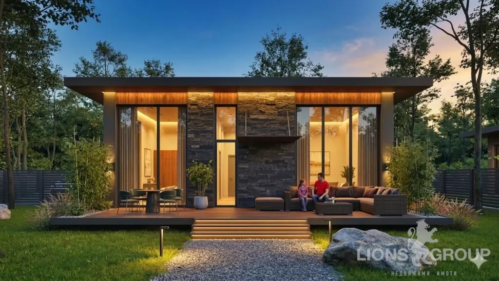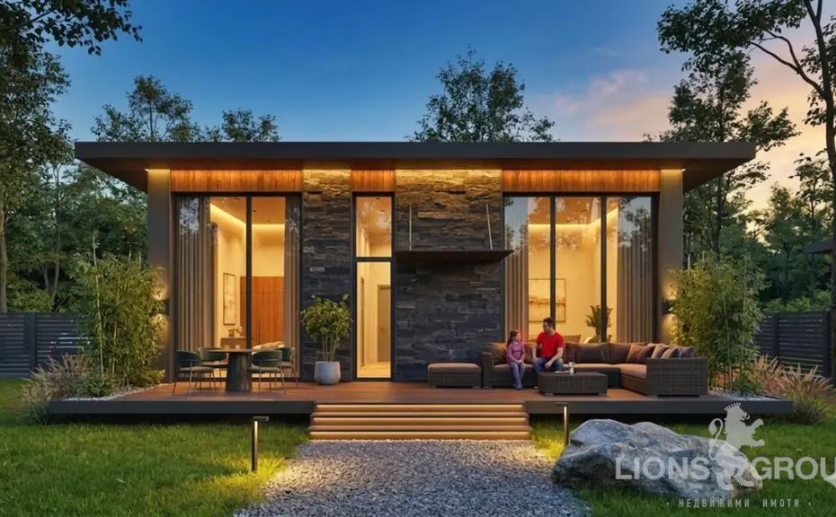 Lions Group Предлагаме за продажба модерна едноетажна къща в процес на строителство, разположена в престижния бутиков комплекс Forest Residence, в тиха и зелена зона в близост до плаж Кабакум, курорта Златни пясъци и град Варна.
