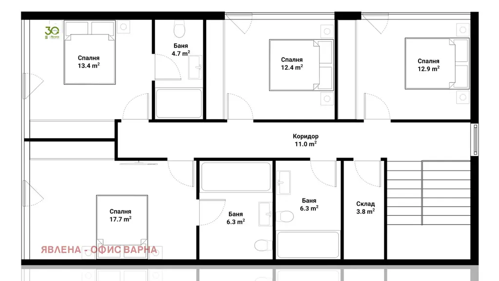 Всяка от къщите е с РЗП от 229 кв.м. и има със следното разпределение: на първо ниво са разположени двустранно осветен дневен тракт, с излаз на веранда, санитарен възел, помощно помещение и входно антре с обособено пространство за дрешник. На второто ниво са разположени четири спални, две от които със собствен санитарен възел, санитарен възел (трети на етажа) за другите две спални и склад/перално помещение. Дневният тракт е с площ от 56 кв.м., двустранно осветен с обособени кухненска, холова и трапезарна част и с излаз прекрасна веранда с площ от 22 кв.м.