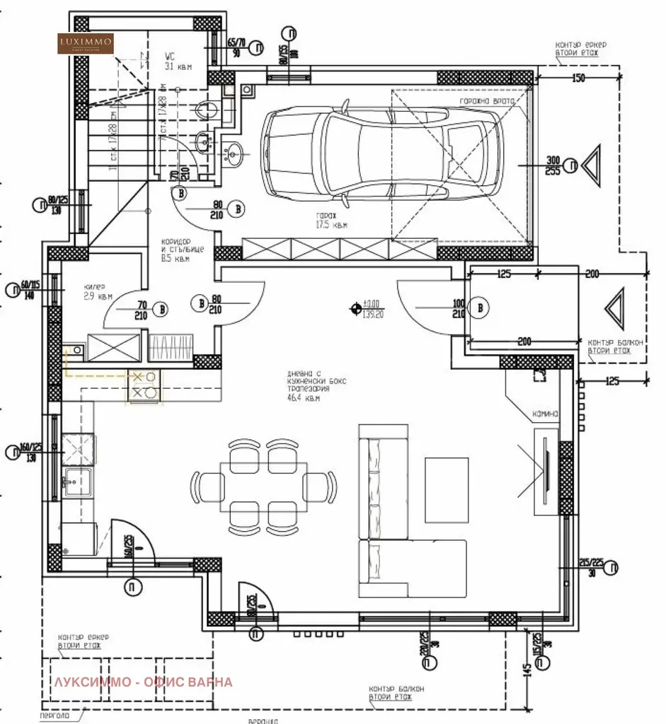 Къщата с РЗП 341 кв.м разполага с двор с площ от 557 кв.м и има следното разпределение: