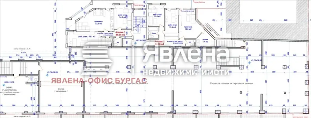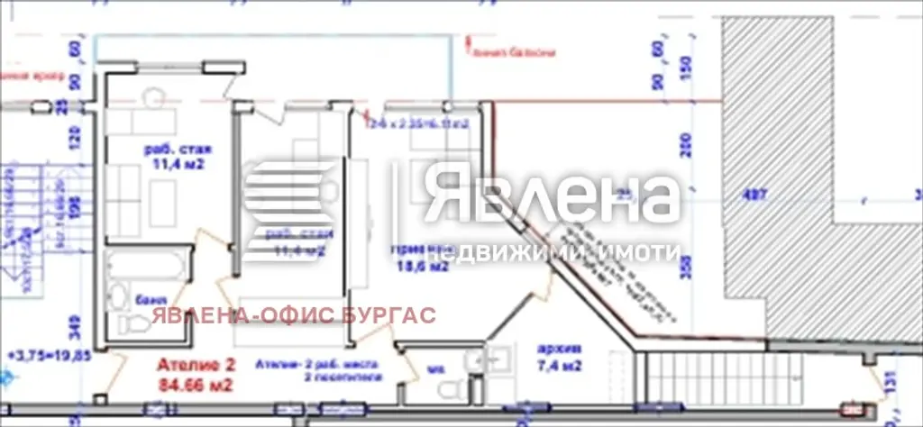 Агенция Явлена продава Тристайно Ателие 2-2, разположено на втория етаж в прекрасна новопостроена сграда, вече с акт 14. Обща Площ 96,48 кв.м. Битови партиди за ток и вода. Ателието разполага с две работни помещения, баня с тоалетна, приемнo помещение, още един санитарен възел, едно помещение за архив и една голяма тераса. Ателието е подходящо за офис, кабинет, а също и за живеене. Изложение - запад. Сградата ще бъде завършена до тапа по БДС, с луксозни общи части. Ето и подробности - монолитна стоманобетонна конструкция;