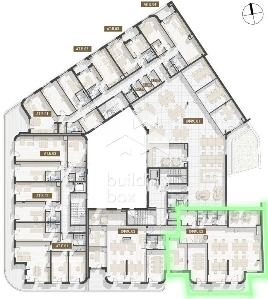 - ЕТАЖНОСТ: Офисът е разположен на 1-ви висок етаж от бутикова сграда с общо 7 етажа.