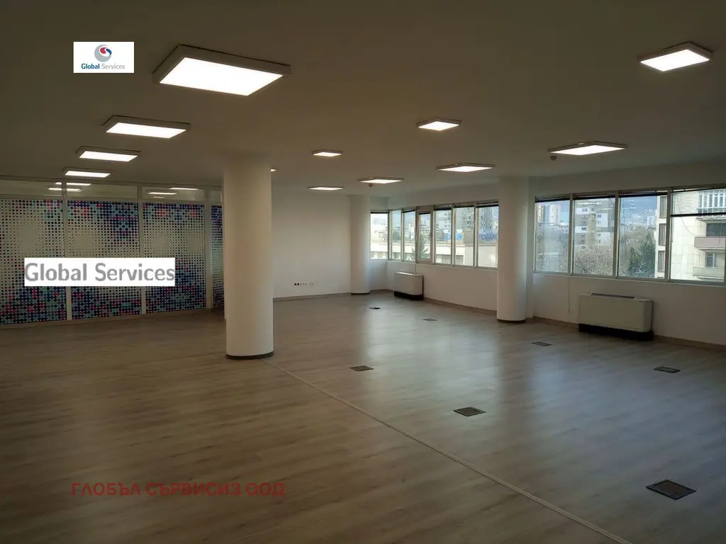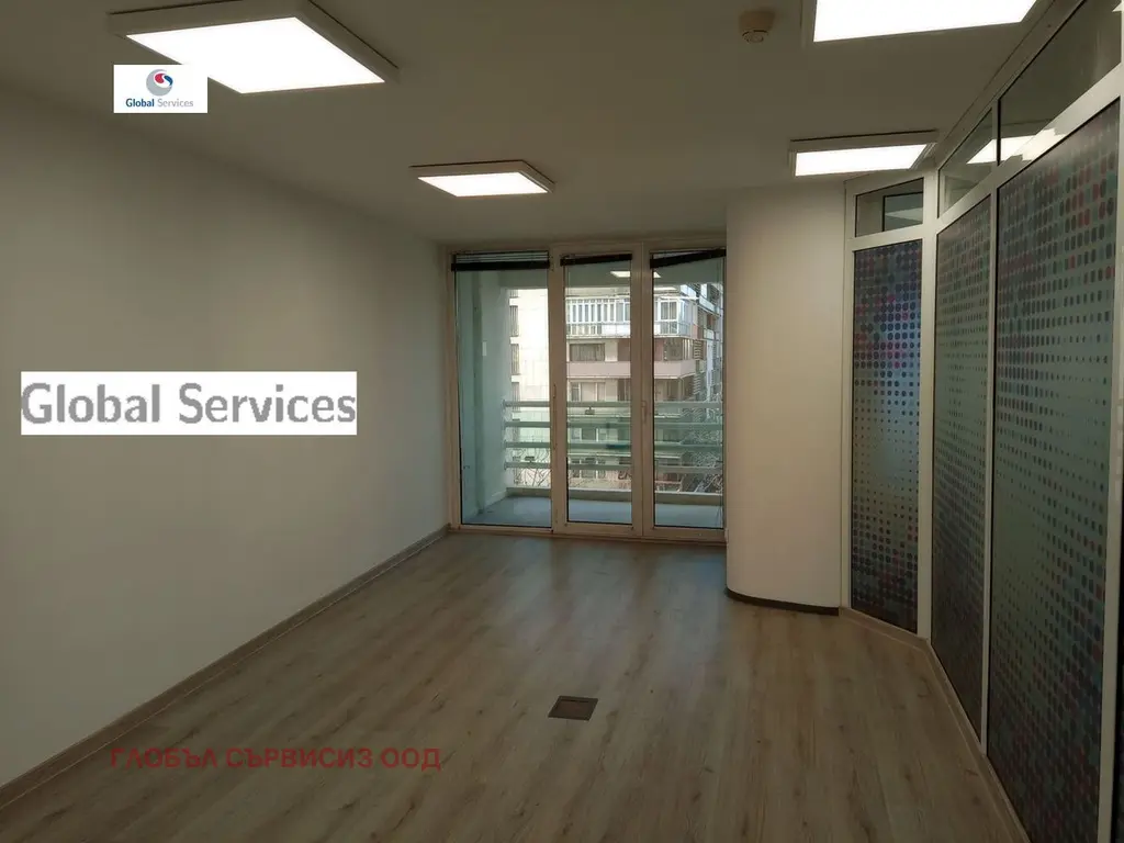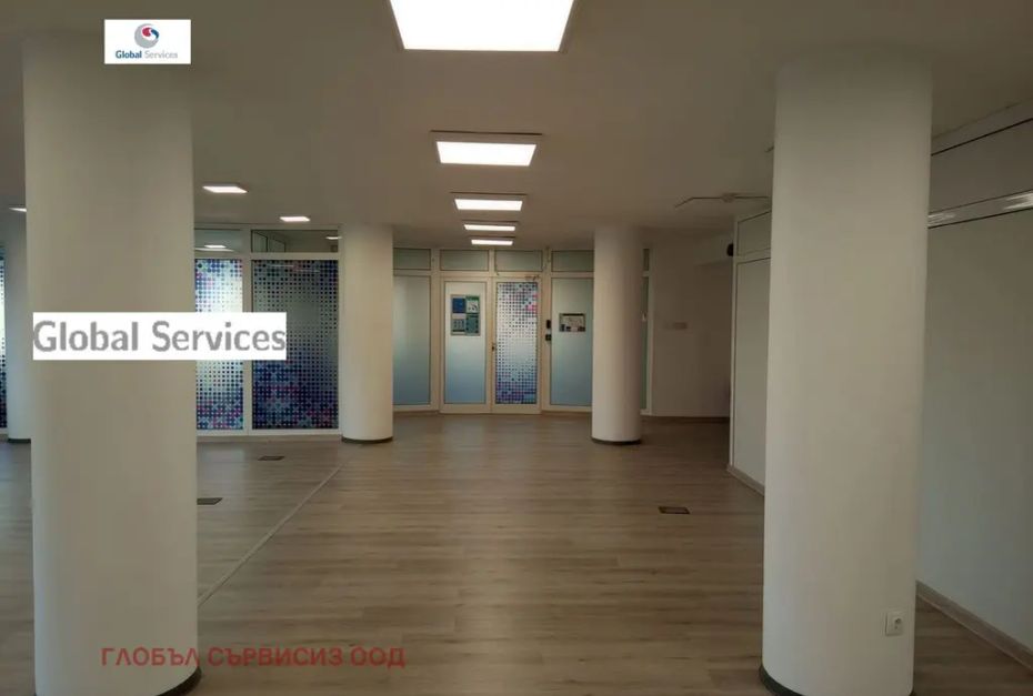 An office is available in a representative building with security and well-maintained common areas, located near VMA, Billa, Hotel Forum, and Blvd. Geshov. The office is an 'open space' type, with the possibility of rearranging the interior layout according to the tenant's needs. The total area includes four separate rooms, a terrace, two restrooms, a kitchenette, and a server room.