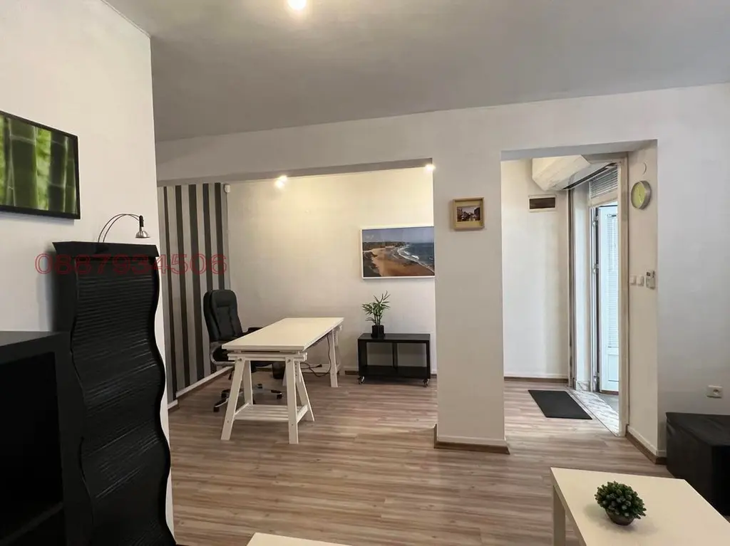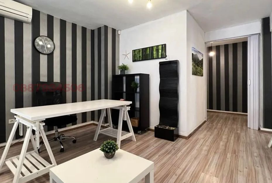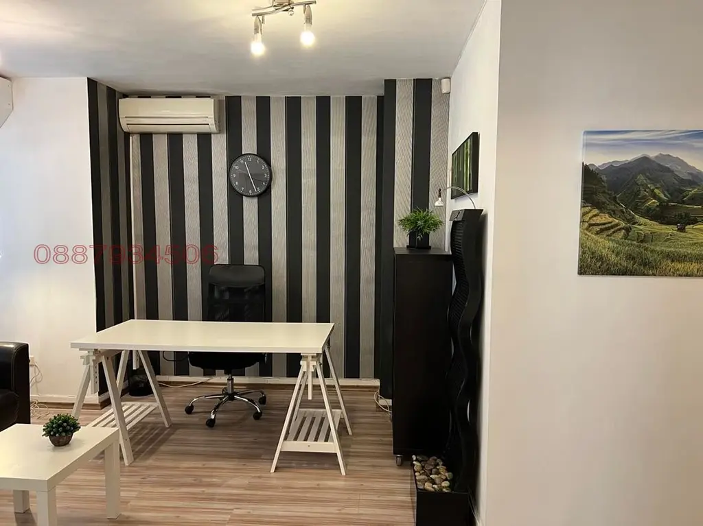 Давам под наем напълно обзаведен офис. Състои се от главно помещение, сервизно помещение и тоалетна (баня). Има 2 бюра с 2 стола, етажерки и диван с масичка. Климатик, ролетни щори, вътрешни щори. На 1 мин. от станция на метро на бул. България. На 5 мин. от НДК с кола. Със собствен външен вход.