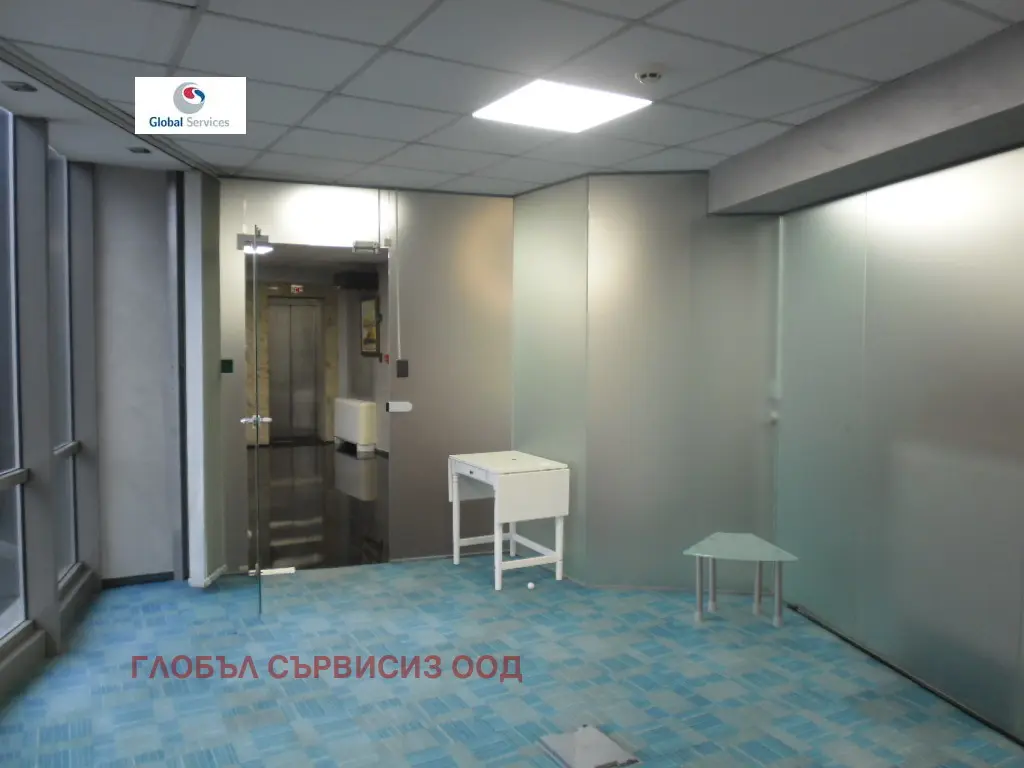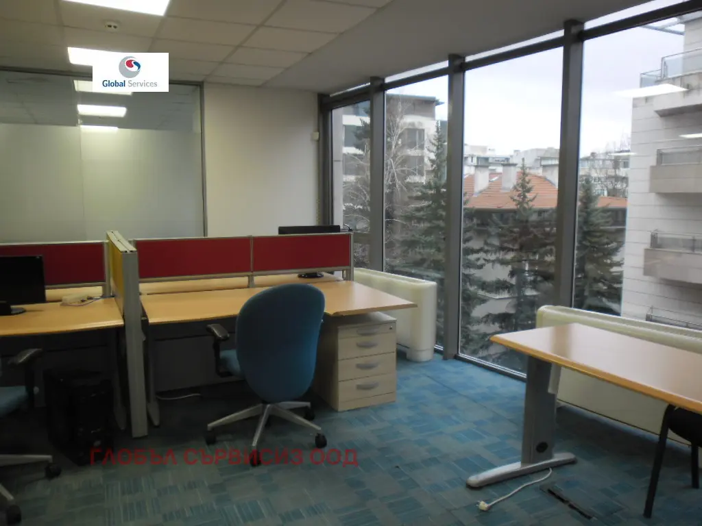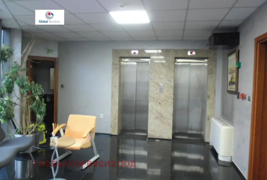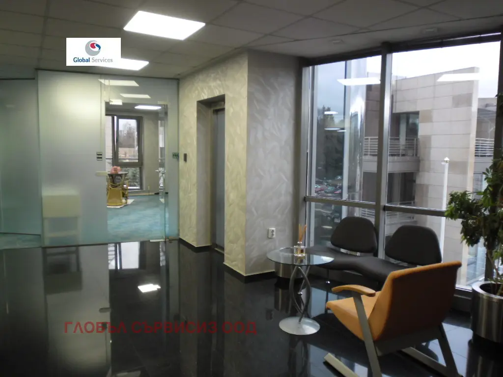 Намира се на 4ти етаж в нова луксозна офис сграда клас А. Близо до метростанция 'Жолио Кюри', и спирки на Градски транспорт. Сградата е построена с луксозни материали полиран гранит с интарзия, инокс, стъкло, асансьор. Сградата е с двоен под, окачени тавани с вградено регулируемо осветление, пълно окабеляване, рецепция и жива охрана, достъп с магнитни карти до всеки етаж.Офисът е на 4ти етаж, тип опън спейс, в момента има преградни стъклени стени, чрез които се получават едно голямо и няколко по-малки работни помещения. Има кухненски бокс и санитарни помещения, както и рецепция. Подова настилка мокет. Има централна климатизация. Към офиса има ТАКСА за охрана и поддръжка 1,5Евро/кв.м. Паркоместа 140Евро. Всички цени са без ДДС. За огледи Мончев 0882 427 984. Оферта 12149.
