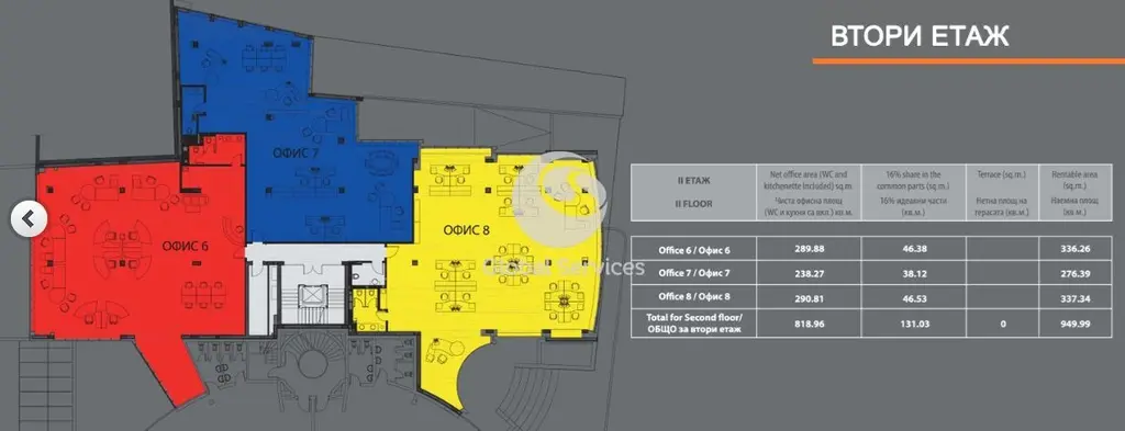Фиброоптична свързаност с Републиканската мрежа, Сертифицирано структурно окабеляване категория 7, UPS централно захранване на всяка работна точка, Централна климатична и вентилационна система със специално програмиране пролет/есен, Вентилаторни конвекторни тела за подов монтаж FlaktWoods с индувидуален контрол, BMS система за управление, Система за контрол на достъпа с персонални магнитни карти с възможност за индувидуално отчитане, Пожароизвестителна система със светлинни индикатори на Siemens , Локална СОТ система за всеки офис, ISDN телефонна централа с рецепция, Индувидуална сървърна кутия за всеки офис, Индувидуални уреди за измерване на консумативните разходи, Ключове и контакти на Schneider , Централно озвучаване на офисите, Подови настилки от антистатичен високоустойчив ламиниран паркет клас А4 и висококачествени антистатични мокетни плочи, Контактни кутии за подово вграждане на Schneider , Двуслойни гипсокартони стени по система на KNAUF с шумоизолираща вата, Антиалергично латексово покритие, Гранитогрес плочи на терасите, Самостоятелен кухненски бокс във всеки офис, Санитарни помещения, изпълнени с първокачествен испански фаянси теракота , Санитарни възли със смесители и аксесоари на Roca