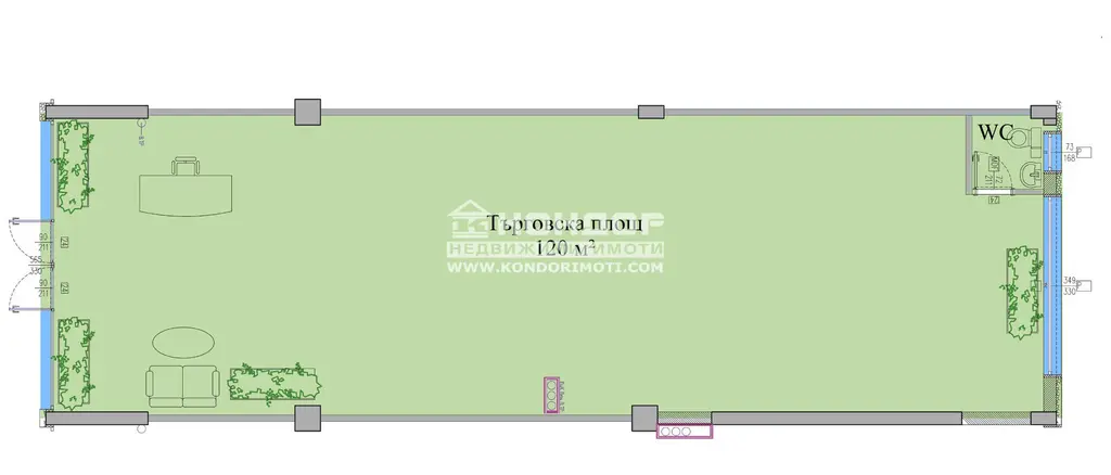 Разположение: Магазинът се състои от едно търговско помещение и санитарен възел. Лицето към булеварда е 6 метра, има втори вход от страната на вътрешния двор и височина 3.50 м. Към търговските части има възможност да се наемат партерни паркоместа!