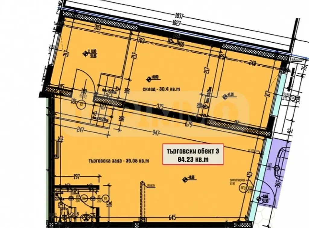Разположен на партерно ниво със следното разпределение: търговска зала 39м², санитарен възел, битовка и складова зона.