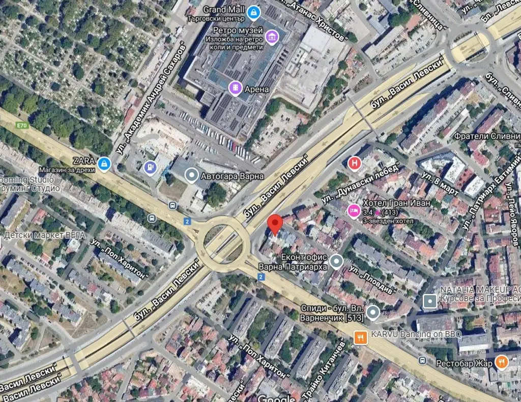 Търговски обект на едно ниво с възможност за паркиране на 2 автомобила. Статут на магазин разположен в прекрасен район с изключително интензивно развитие, огромен автомобилен трафик и човекопоток. Построената нова и вече действаща автогара, Гранд Мол и бързо строящия се в момента нов Лидъл /срещу входа на магазина/, който в рамките на следващите 3 месеца ще бъде завършен и съвсем скоро пуснат в действие, гарантират един добър просперитет за дейността на тази локация. Района около търговският обект е с усилено многоетажно жилищно строителство с над повече от 15 строящи се в момента сгради в радиус от само 300 метра.