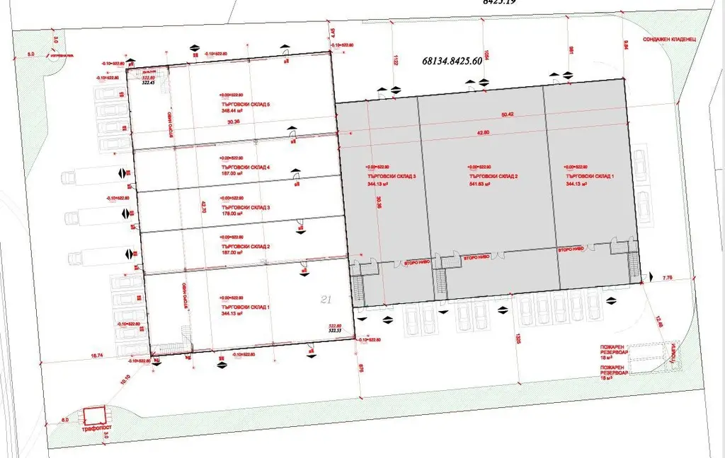 * Склад 2 - със застроена площ от 564,7кв.м. и разгъната застроена площ от 683кв.м., състоящ се от:
