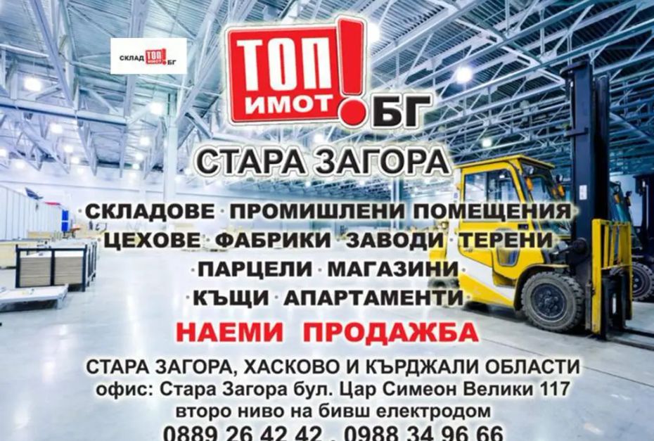 Продава складово, промишлено помещение, ново строителство на 15 км. в близост до гр. Стара Загора. Застроена площ от 740 кв.м. с две складови помещения и офисна част, строителство с термопанел и желязобетонна конструкция, под шлайфан бетон, водоснабдено и електрифицирано. Площ на терена - 2670 кв.м.Подходящо за много видове дейности! Цената на имота е без ДДС. Лице за контакт Огнян Георгиев.